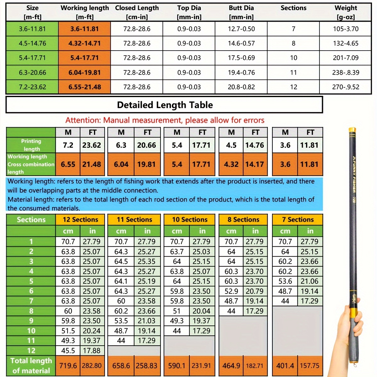 Caution: Human error may occur during measurement. The working length is the part of the fishing gear that extends beyond the insertion point, with some overlap at the connection. Material length refers to the comed length of each section of the rod, representing the total material used.